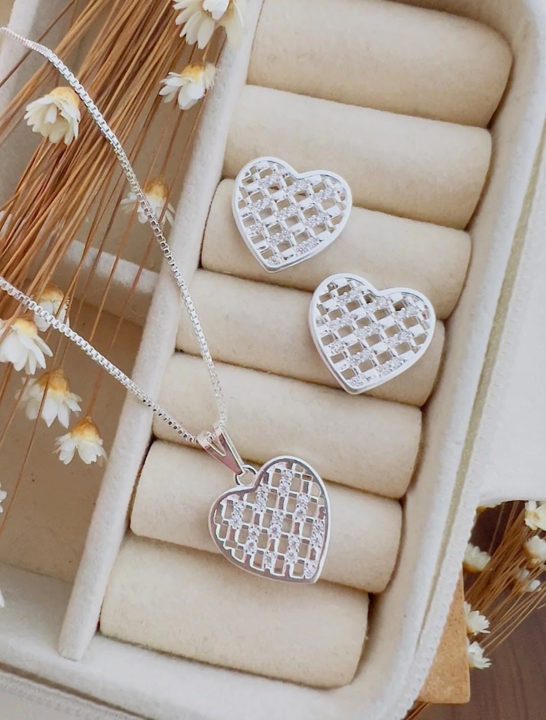 Conjuntinho brinco e colar de coração folheado à prata com pedrinhas de zircônia.